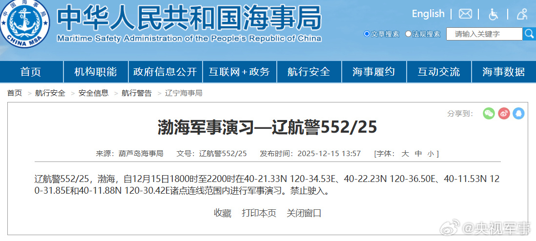 据中国海事局网站音讯,葫芦岛海事局发布飘舞教养,12月15日18时至22时,渤海部分海域进行军事演习,拦阻驶入。